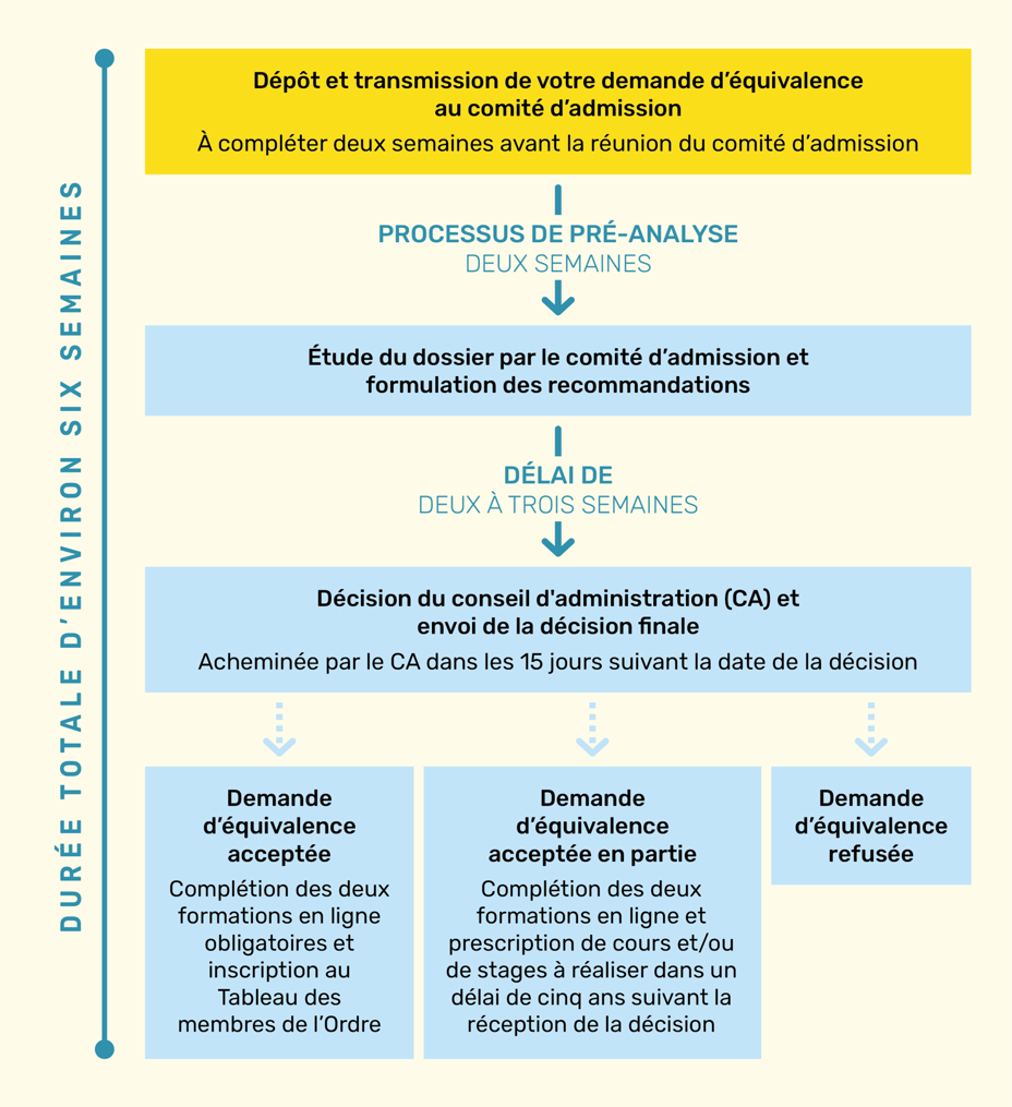 La durée globale du processus d'admission dépend de la décision rendue par le CA. La personne pour qui la demande d'équivalence est acceptée peut s'inscrire au Tableau des membres sans délai, dès la réception de la preuve de réussite des deux formations en ligne totalisant 11 heures. Si un programme de formation est imposé, la durée du processus d'admission dépendra du nombre de cours et stages demandés.